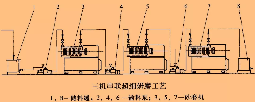 三機(jī)串聯(lián)工藝可以縮短研磨時間,提高研磨效率;研磨產(chǎn)品粒度細(xì)而且均勻。但設(shè)備較多,占地面積較大。