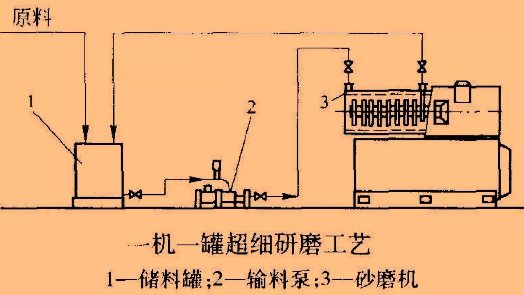 料漿在1臺砂磨機(jī)、1只儲料罐內(nèi)循環(huán)研磨,直至產(chǎn)品細(xì)度達(dá)到要求為止。此工藝過程簡單、設(shè)備少、占地面積小、操作方法簡單。